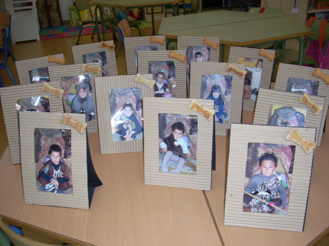 Ya hemos terminado nuestros "marcos prehistóricos". Los materiales utilizados son: cartulina, cartón ondulado, plástico de encuadernar, cola, galletas de perro (con forma de hueso) y por supuesto... la foto de estos "pequeños y pequeñas prehistóricos/as".